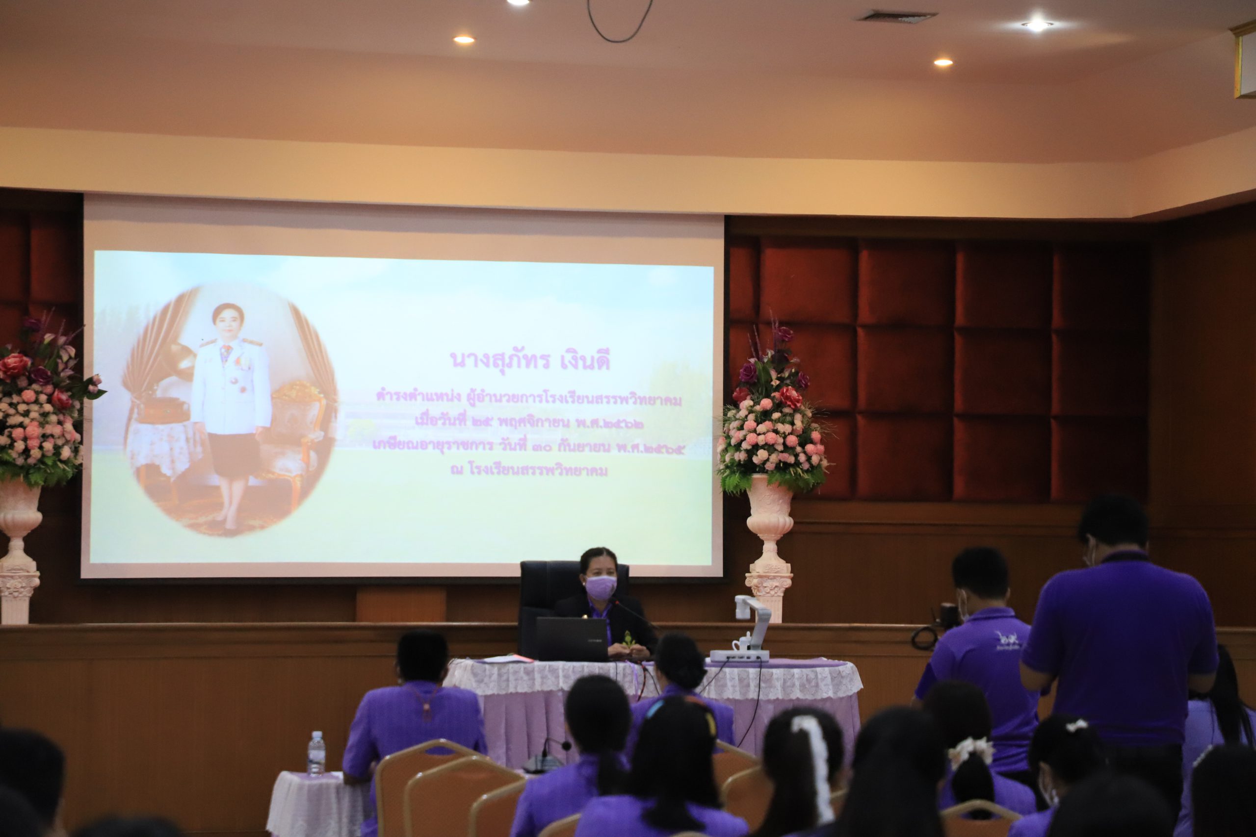 วันที่ ๒๙ กันยายน พ.ศ. ๒๕๖๕ นางสุภัทร เงินดี ผู้อำนวยการโรงเรียนสรรพวิทยาคม จัดการประชุมครูและบุคลากรทางการศึกษาประจำเดือน ครั้งที่ ๕/๒๕๖๕ และ พิธีลงนามส่งมอบงานในหน้าที่รับผิดชอบผู้อำนวยการโรงเรียนสรรพวิทยาคม ระหว่างนางสุภัทร เงินดี ผู้อำนวยการโรงเรียนกับนางนารินทร์ โทนปั่น รองผู้อำนวยการฝ่ายบริหารงานบุคคล ณ หอประชุมเฉลิมพระเกียรติ โรงเรียนสรรพวิทยาคม