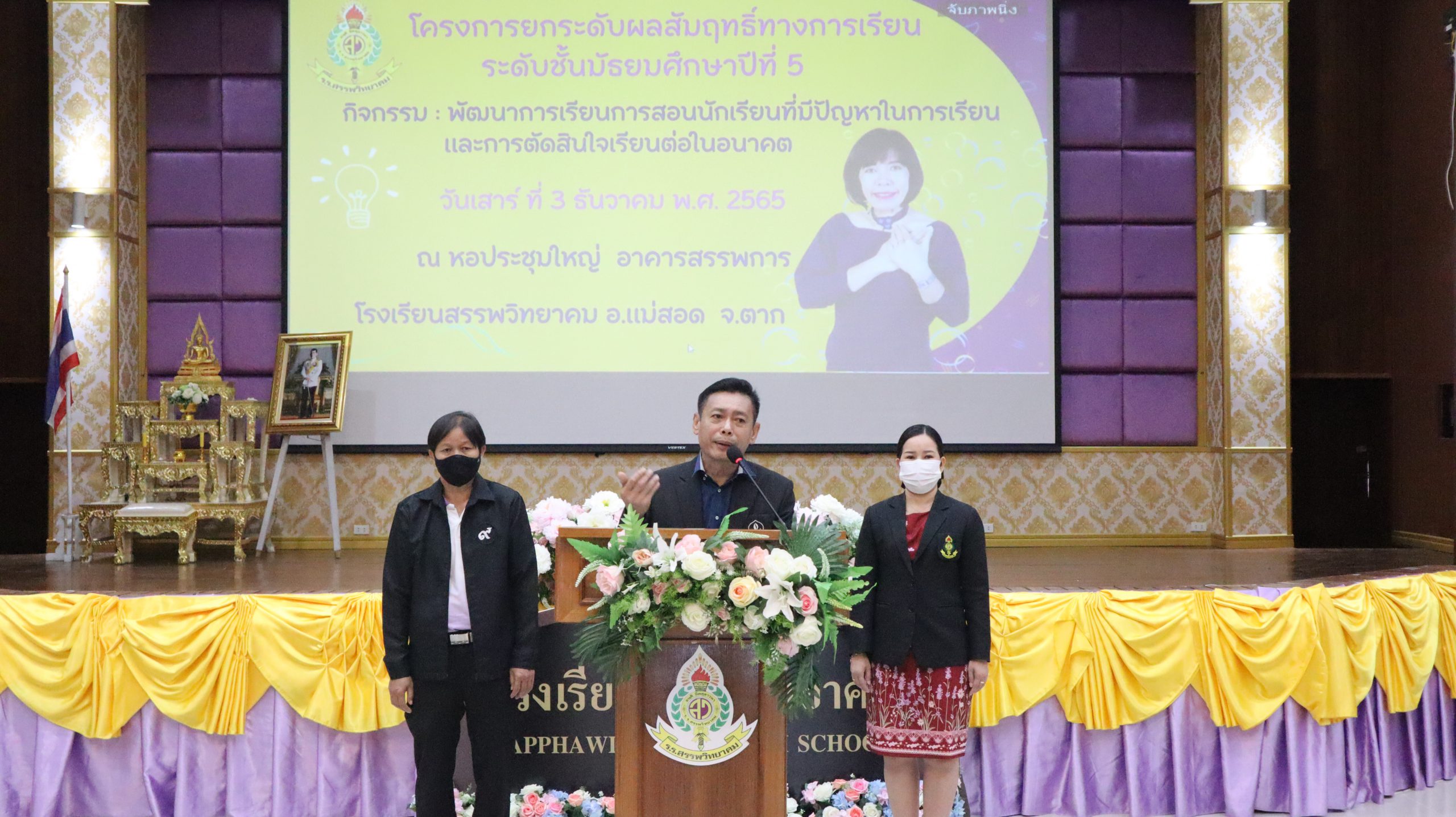 วันที่ ๓ ธันวาคม พ.ศ. ๒๕๖๕ นายกฤษณะ เครืออยู่ ผู้อำนวยการโรงเรียนสรรพวิทยาคม พร้อมด้วย คณะผู้บริหาร เป็นประธานเปิด โครงการยกระดับผลสัมฤทธิ์ทางการเรียนระดับชั้นมัธยมศึกษาปีที่ ๕ กิจกรรมพัฒนาการเรียนการสอนนักเรียนที่มีปัญหาในการเรียนและการตัดสินใจเรียนต่อในอนาคต โดยมี นางสาวนวรัตน์ เหลือศรีจันทร์ หัวหน้าระดับชั้นมัธยมศึกษาปีที่ ๕ กล่าวรายงานวัตถุประสงค์ การดำเนินกิจกรรม โดยได้รับเกียรติจากดีเจพี่อ้อย นภาพร ไตรวิทย์วารีกุล เป็นวิทยากรในการอบรบ พิเศษในภาคเช้าหัวข้อ “ด. เมื่อถึงทางแยก เราจะเลือกอย่างไร ๒. การสร้างแรงบันดาลใจในการเรียน๓. ทำไมต้องเดี่ยว เริ่มเลย ๔. วิธีการใช้ชีวิตในวัยรุ่น” ณ หอประชุมใหญ่ อาคารสรรพการ โรงเรียนสรรพวิทยาคม
