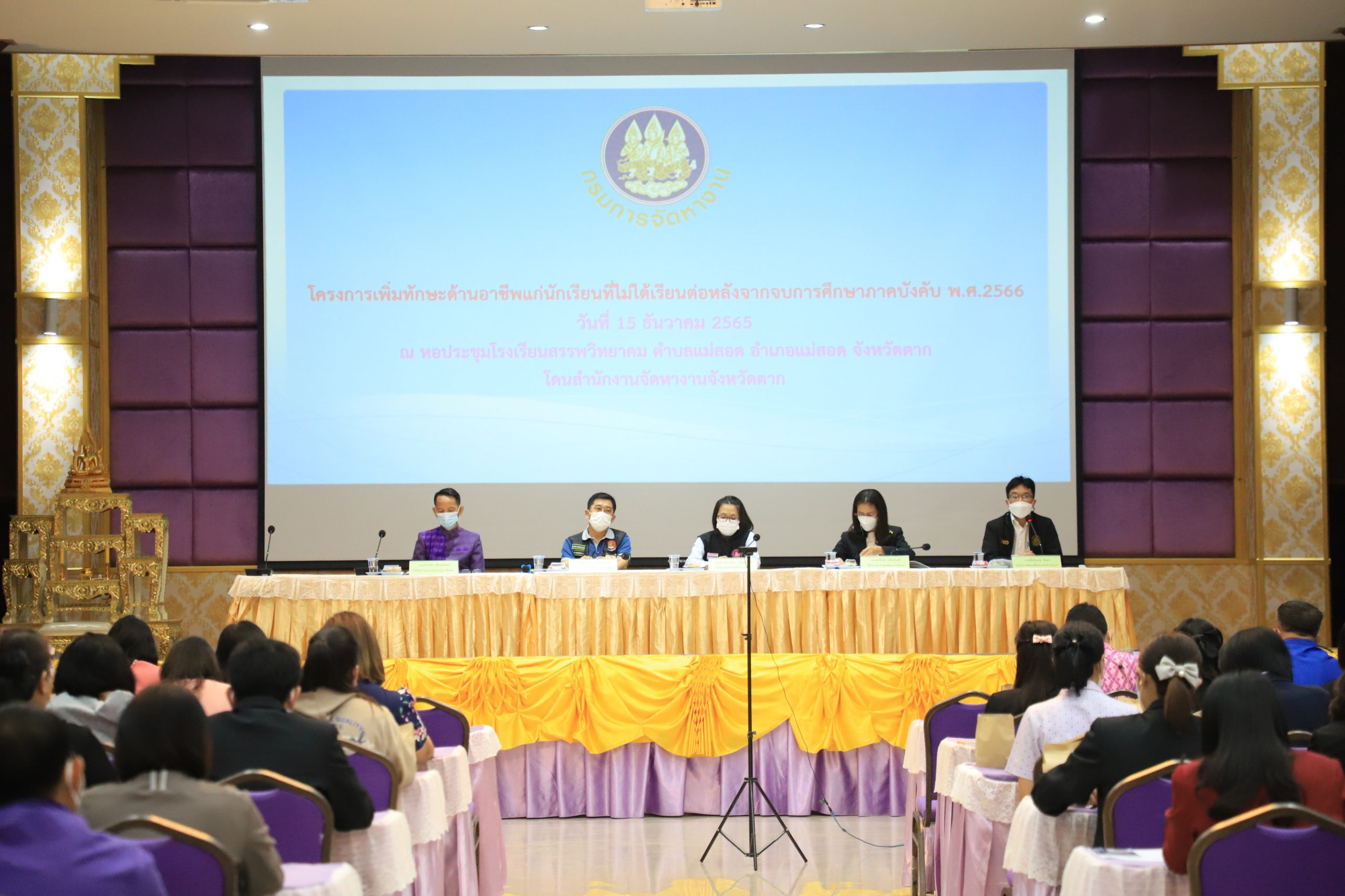 วันที่ ๑๕ ธันวาคม พ.ศ. ๒๕๖๕ นายกฤษณะ เครืออยู่ ผู้อำนวยการโรงเรียนสรรพวิทยาคม มอบหมายให้ นางพัทธนันท์ จิรเลิศธนานนท์ รองผู้อำนวยการโรงเรียนสรรพวิทยาคม และคณะครูโรงเรียนสรรพวิทยาคม ร่วมอบรม โครงการเพิ่มทักษะด้านอาชีพแก่นักเรียนที่ไม่ได้เรียนต่อหลังจากจบการศึกษาภาคบังคับ พ.ศ.๒๔๖๖ จัดโดย สำนักงานจัดหางานจังหวัดตาก ณ หอประชุมใหญ่อาคารสรรพการ โรงเรียนสรรพวิทยาคม