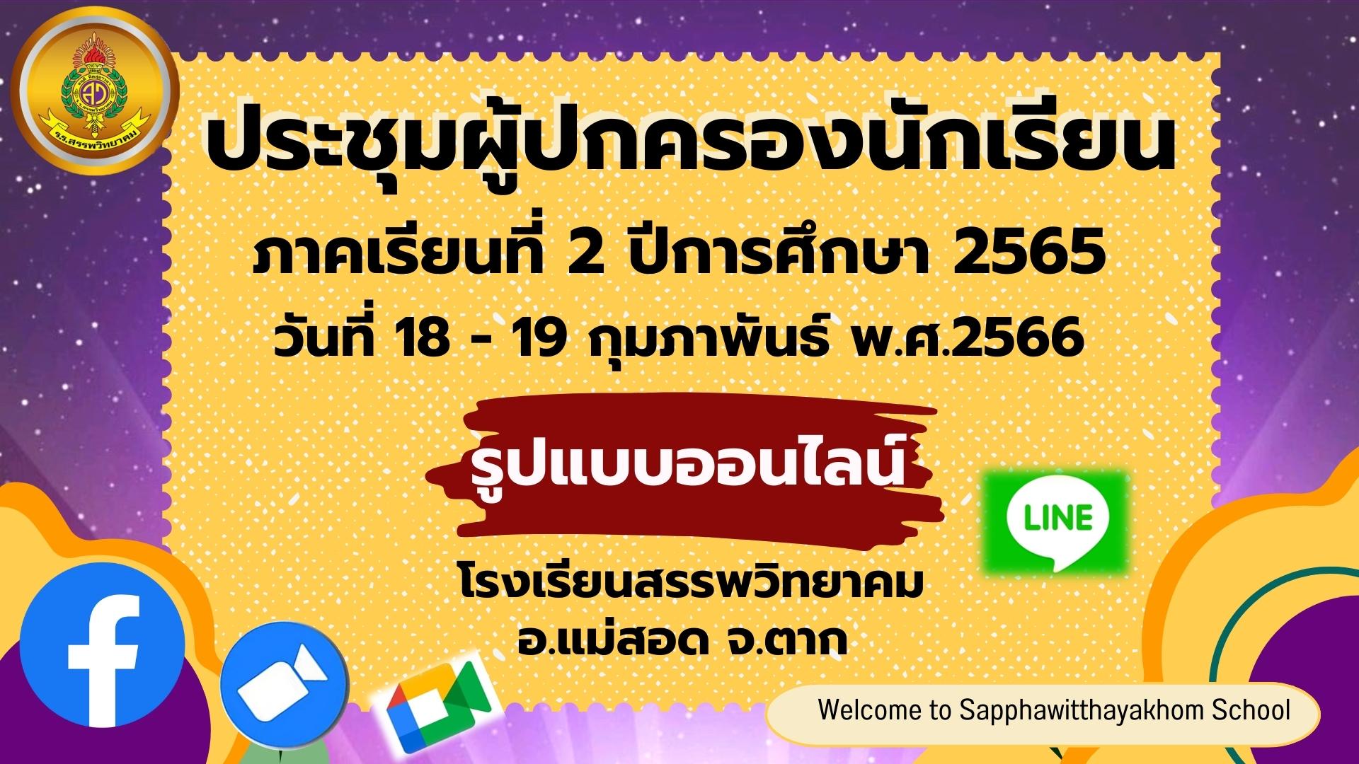 วันที่ ๑๘-๑๙ กุมภาพันธ์ พ.ศ. ๒๕๖๖ นายกฤษณะ เครืออยู่ ผู้อำนวยการ โรงเรียนสรรพวิทยาคม พร้อมด้วยคณะผู้บริหาร และคณะครู จัดประชุมผู้ปกครองภาคเรียนที่ ๒ ประจำปีการศึกษา ๒๕๖๕ ในรูปแบบออนไลน์ ผ่านแอปพลิเคชันต่างๆ โดยกำหนดให้ผู้ปกครองได้พบกับครูที่ปรึกษาในแต่ละระดับชั้นตามวันและเวลาที่กำหนด เพื่อแจ้งนโยบายของทางโรงเรียนและคะแนนเก็บของนักเรียนก่อนสอบปลายภาคเรียนที่ ๒ ปีการศึกษา ๒๕๖๕ รวมทั้งระบบการดูแล ช่วยเหลือนักเรียน และตอบข้อซักถามต่างๆ ของผู้ปกครอง ในรูปแบบออนไลน์