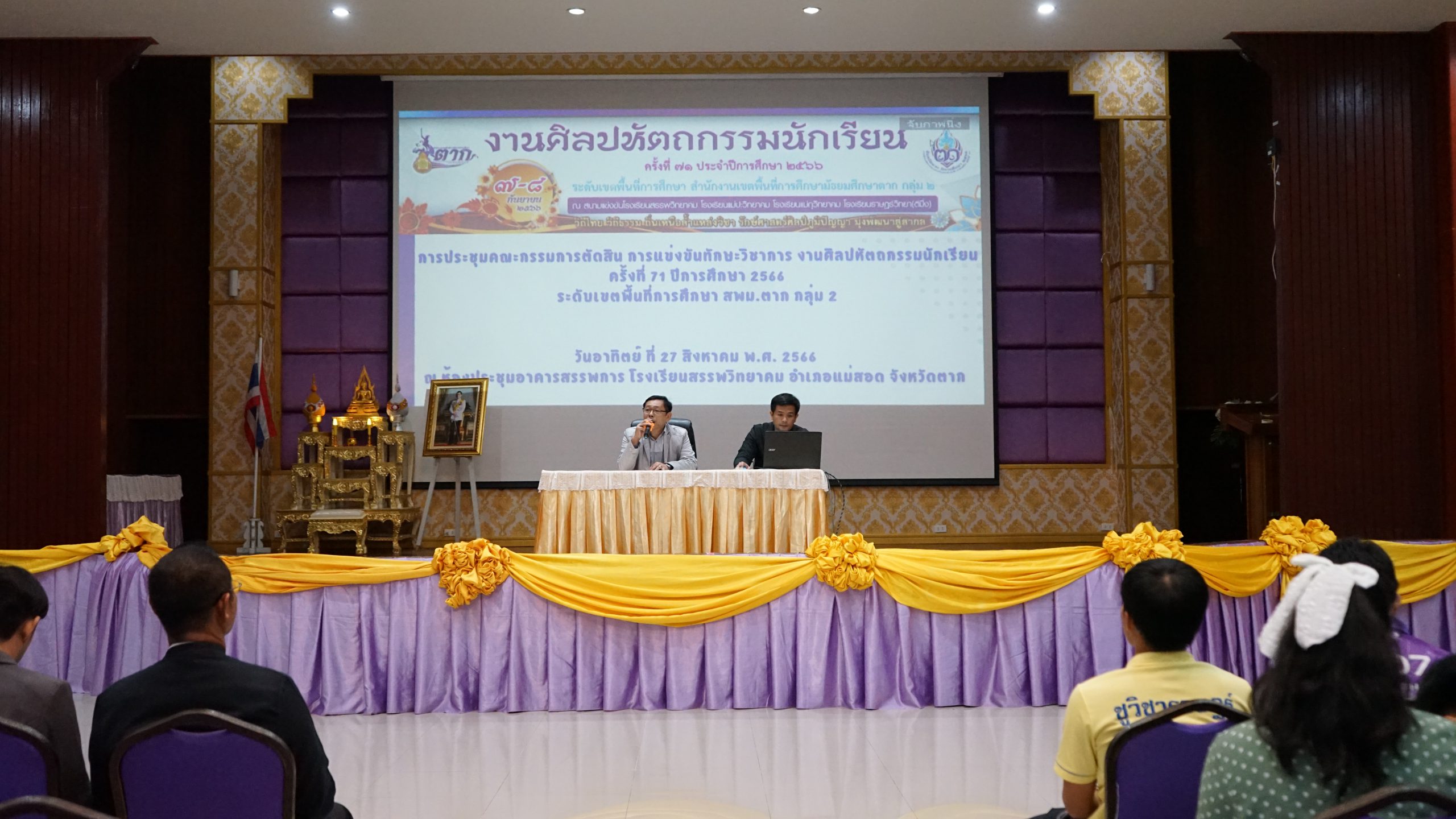 วันที่ ๒๗ สิงหาคม พ.ศ. ๒๕๖๖ นายกฤษณะ เครืออยู่ ผู้อำนวยการโรงเรียนสรรพวิทยาคม เป็นประธานเปิดการประชุมคณะกรรมการตัดสิน การแข่งขันทักษะวิชาการ งานศิลปหัตถกรรม นักเรียน ครั้งที่ ๗๑ ปีการศึกษา ๒๕๖๖ ระดับเขตพื้นที่ การศึกษา สพม.ตาก กลุ่ม ๒ เพื่อชี้แจงกำหนดการและกฎกติกาในการแข่งขันงานศิลปหัตถกรรม นักเรียน ครั้งที่ ๗๑ ปีการศึกษา ๒๕๖๖ ณ หอประชุมใหญ่อาคารสรรพการ