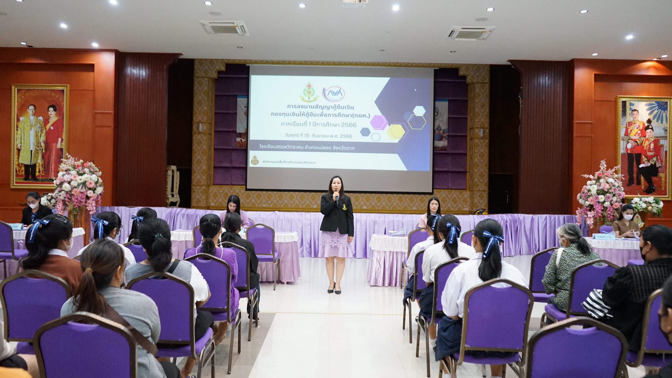 วันที่ ๑๕ กันยายน พ.ศ. ๒๕๖๖ นายกฤษณะ เครืออยู่ ผู้อำนวยการโรงเรียนสรรพวิทยาคม มอบหมายให้ นางพัทธนันท์ จิรเลิศธนานนท์ รองผู้อำนวยการโรงเรียนสรรพวิทยาคม เป็นประธานเปิดกิจกรรม การลงนามสัญญากู้ยืมเงิน กองทุนเงินให้กู้ยืมเพื่อการศึกษา (กยศ.) ภาคเรียนที่ ๑ ปีการศึกษา ๒๕๖๖ เพื่อทําสัญญาในการกู้ยืมเงิน กองทุนเงินให้กู้ยืมเพื่อการศึกษา ณ หอประชุมใหญ่ อาคารสรรพการ โรงเรียนสรรพวิทยาคม
