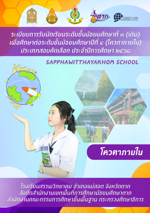 ระเบียบการรับนักเรียนระดับชั้นมัธยมศึกษาปีที่ ๓ (เดิม) เพื่อศึกษาต่อระดับชั้นมัธยมศึกษาปีที่ ๔ (โควตาภายใน) ประเภทสอบคัดเลือก ประจำปีการศึกษา ๒๕๖๘