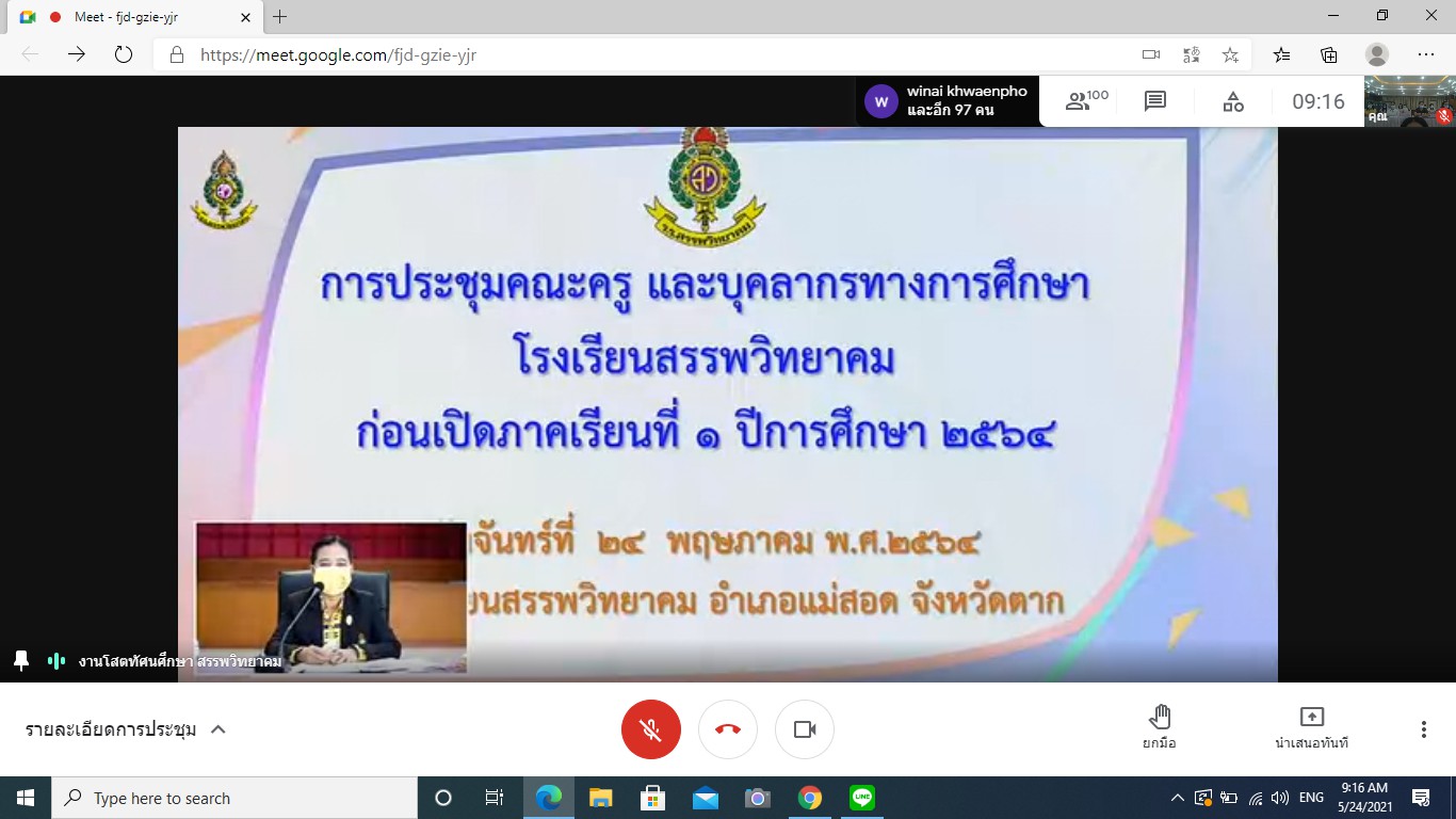 วันที่ ๒๔ พฤษภาคม พ.ศ. ๒๕๖๔ นางสุภัทร เงินดี ผู้อำนวยการโรงเรียนสรรพวิทยาคมพร้อม ด้วย คณะผู้บริหาร คณะครู และบุคลากรทางการศึกษา จัดการประชุมครูและบุคลากรทางการศึกษา ประจำเดือน ในรูปแบบออนไลน์ โดยใช้ Google Meet โดยมี นางสุภัทร เงินดี ผู้อำนวยการโรงเรียนสรรพวิทยาคม เป็นประธานการประชุม เนื่องในสถานการณ์การแพร่ระบาดของไวรัสโคโรนา (COVID-19) ทางโรงเรียนสรรพวิทยาคมมีมาตรการป้องกันที่เคร่งครัด จึงดำเนินการประชุมออนไลน์ผ่าน Vided Conference ณ โรงเรียนสรรพวิทยาคม