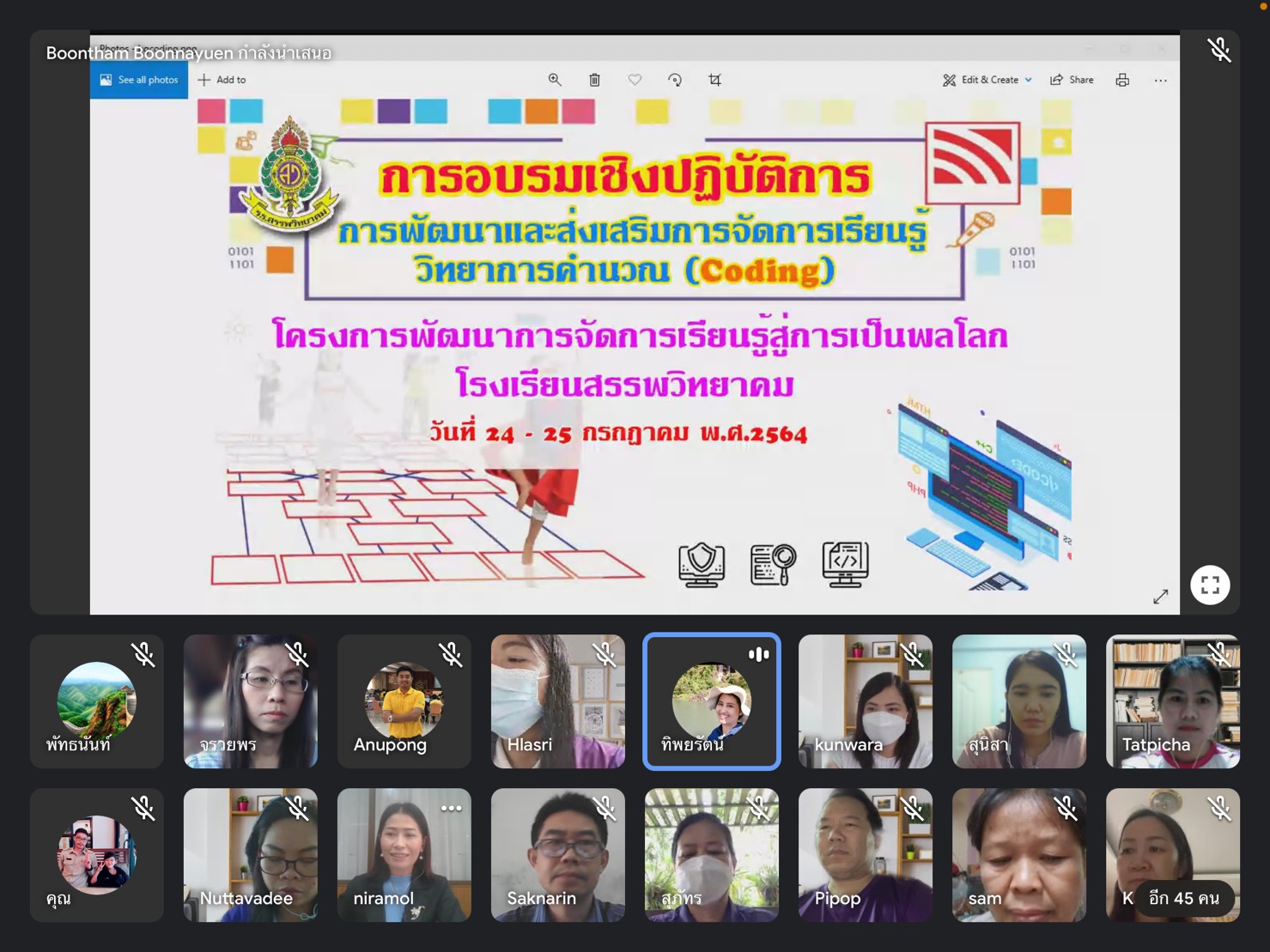 วันที่ ๒๔ กรกฎาคม พ.ศ. ๒๕๖๔ นางสุภัทร เงินดี ผู้อำนวยการโรงเรียนสรรพวิทยาคม พร้อมด้วยคณะผู้บริหาร คณะครู จัดการอบรมเชิงปฏิบัติการพัฒนาและส่งเสริมการจัดการเรียนรู้วิทยากาคำนวณ (Coding) โครงการพัฒนาการจัดการเรียนรู้สู่การเป็นพลโลก ระหว่างวันที่ ๒๔-๒๕ กรกฎาคม ๒๕๖๔ รูปแบบออนไลน์ (Google Meet) โดยมี นางสุภัทร เงินดี ผู้อำนวยการโรงเรียนสรรพวิทยาคม เป็นประธานในพิธี นางสาวทิพยรัตน์ ส่งประเสริฐ รองผู้อำนวยการโรงเรียนสรรพวิทยาคม เป็นผู้กล่าวรายงาน ณ โรงเรียนสรรพวิทยาคม