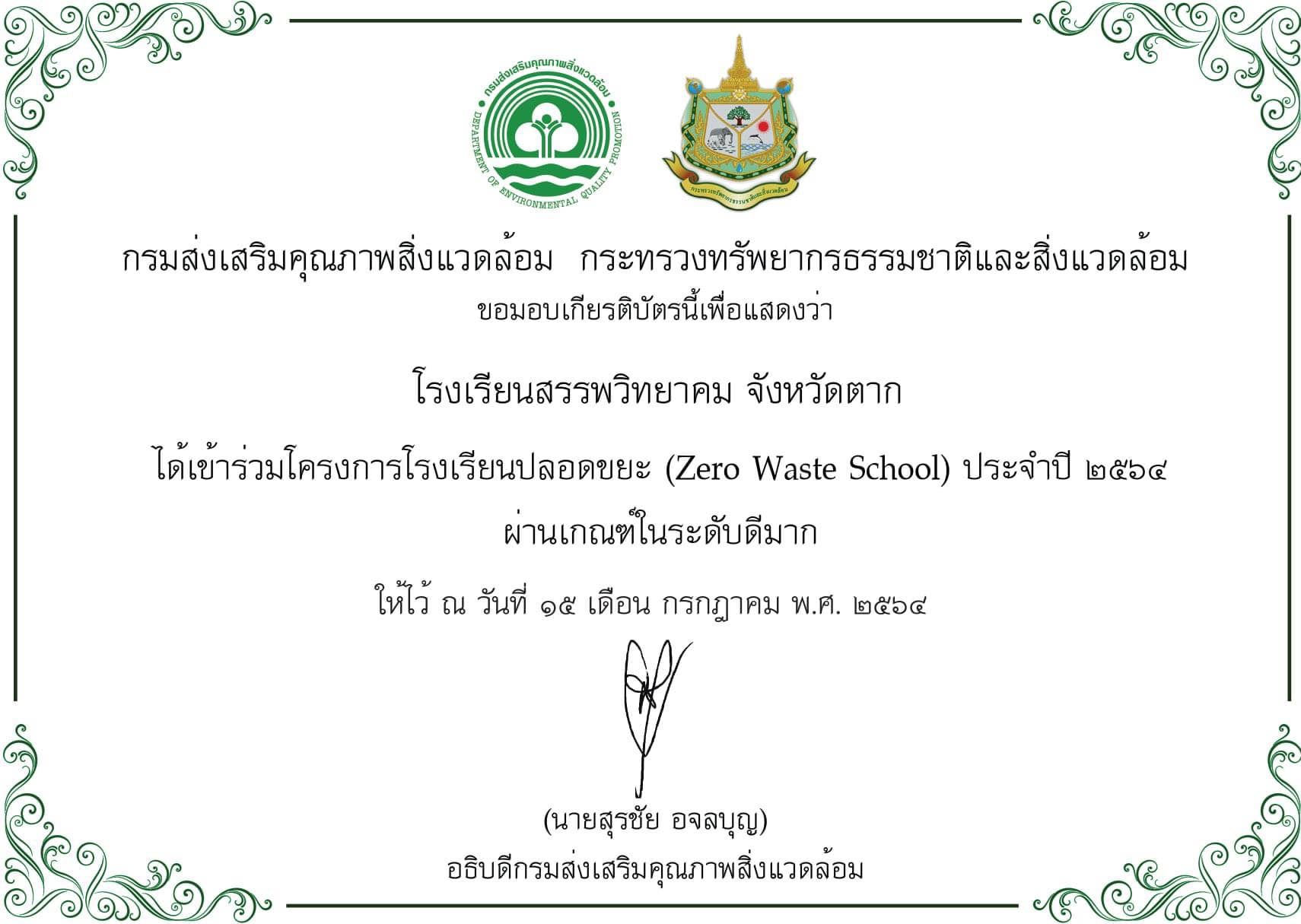 วันที่ ๒๗ สิงหาคม พ.ศ. ๒๕๖๔ นางสุภัทร เงินดี ผู้อำนวยการโรงเรียนสรรพวิทยาคม พร้อมด้วยคณะครูและนักเรียน ร่วมแสดงความยินดี กับผลงานโครงการโรงเรียนปลอดขยะ(Zero Waste School) ประจำปี ๒๕๖๔ ซึ่งผ่านเกณฑ์ในระดับดีมาก จากกรมส่งเสริมคุณภาพสิ่งแวดล้อมกระทรวงทรัพยากรธรรมชาติและสิ่งแวดล้อม รับผิดชอบโดย คณะกรรมการดำเนินงานโครงการโรงเรียนปลอดขยะ Zero Waste School โรงเรียนสรรพวิทยาคม