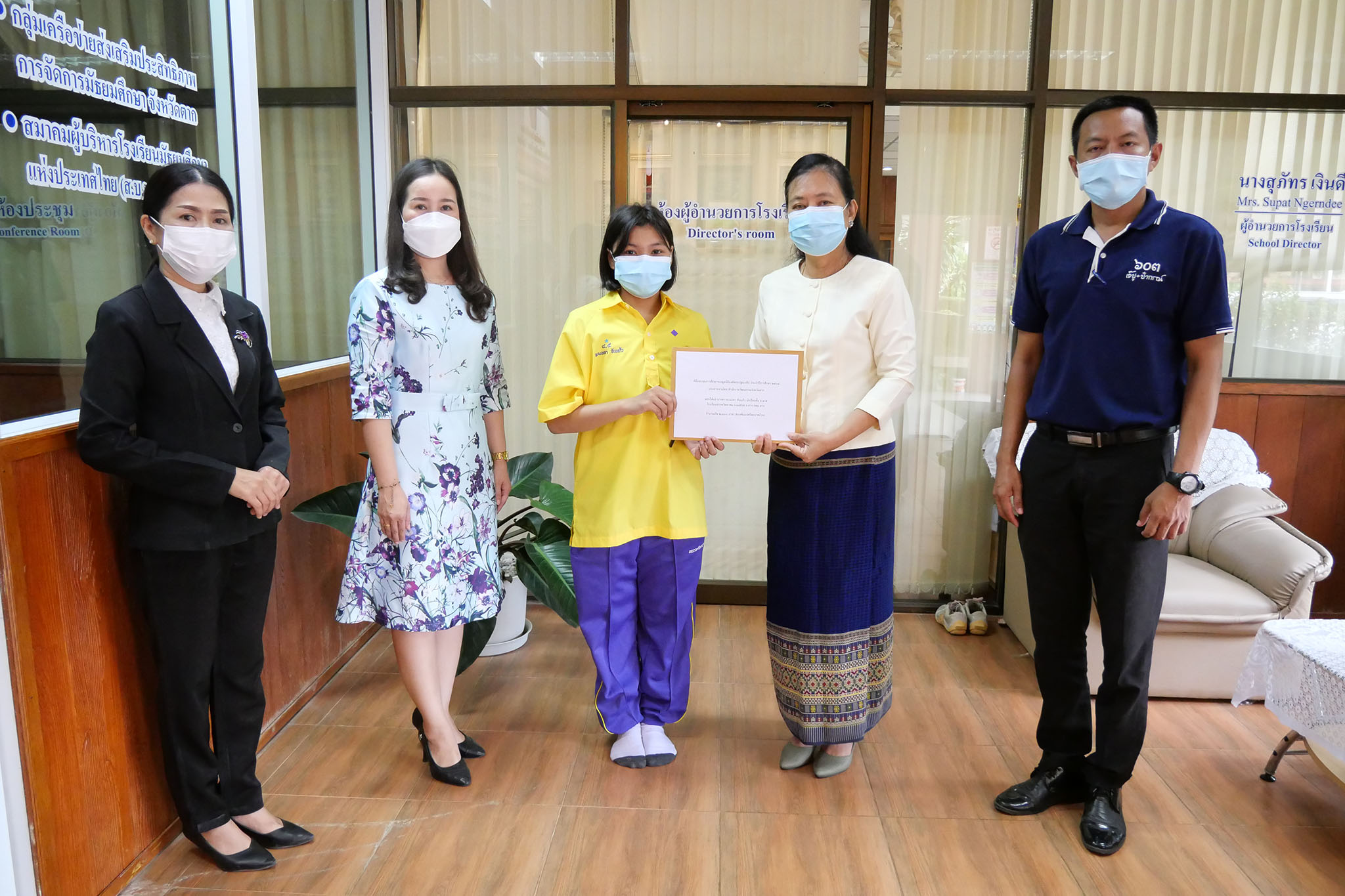 วันที่ ๓ กันยายน พ.ศ. ๒๕๖๔ นางสุภัทร เงินดี ผู้อำนวยการโรงเรียนสรรพวิทยาคม พร้อมด้วยคณะผู้บริการ คณะครู เป็นผู้แทนในการมอบทุนการศึกษาจากมูลนิธิองค์พระปฐมเจดีย์ ให้แก่ น.ส.อะมอดา ขันแก้ว ม.๔/๕จำนวนเงิน ๒,๘๐๐ บาท โดยมีคณะผู้บริหารร่วมเป็นเกียรติในการรับมอบ ดังกล่าว โรงเรียนสรรพวิทยาคมดำเนินการตามมาตราการการป้องกันการแพร่ระบาดของโรคติดเชื้อไวรัสโคโรนา 2019 (COVID-19) อย่างเคร่งครัดและรัดกุม ณ โรงเรียนสรรพวิทยาคม