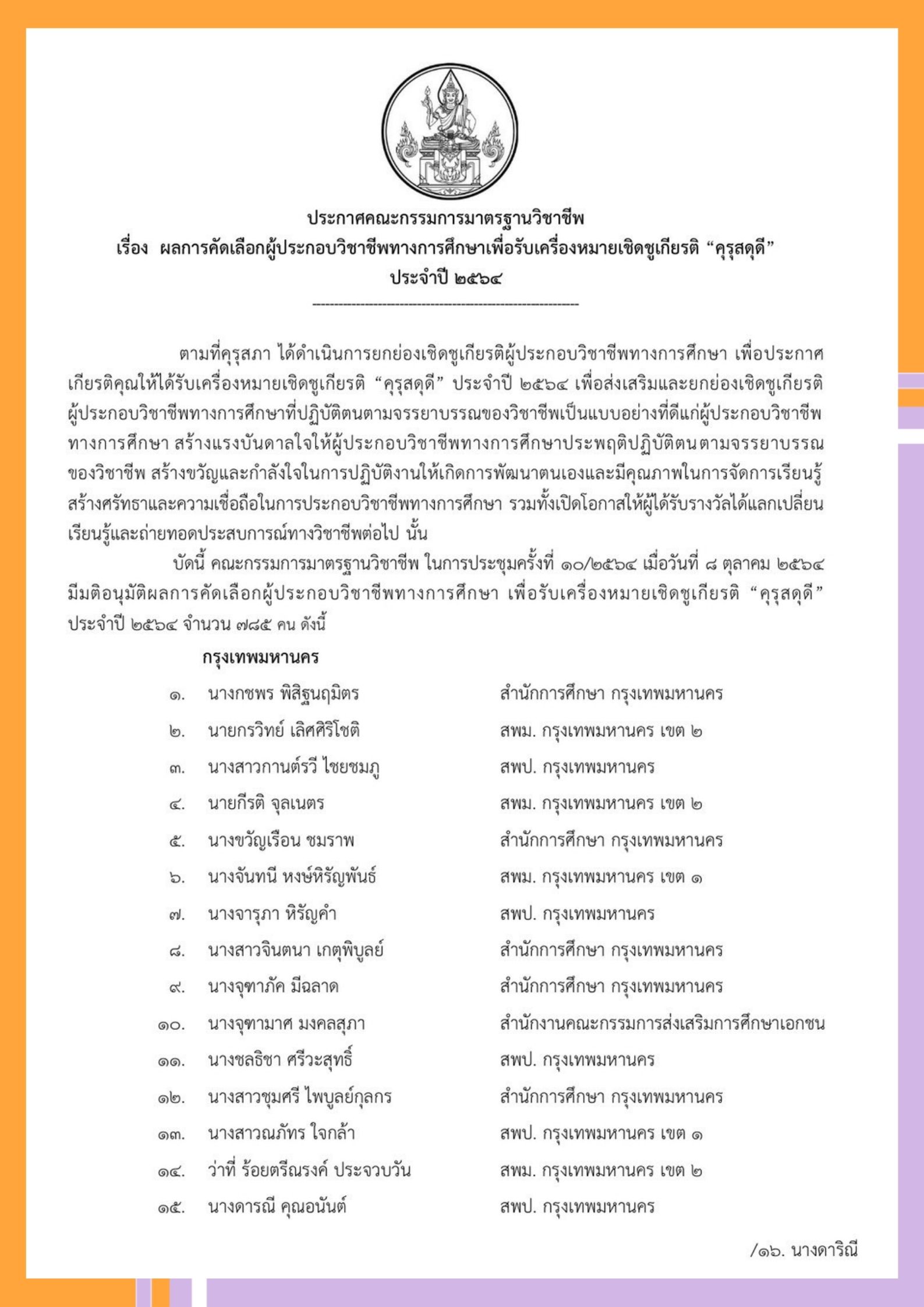 วันที่ ๒๗ ตุลาคม พ.ศ. ๒๕๖๔ นางสุภัทร เงินดี ผู้อำนวยการโรงเรียนสรรพวิทยาคม ได้รับการคัดเลือกผู้ประกอบวิชาชีพทางการศึกษา เพื่อรับเครื่องหมายเชิดชูเกียรติ “คุรุสดุดี” ประจำปี ๒๕๖๔ จำนวนทั้งหมด ๗๘๕ คน เพื่อส่งเสริมและยกย่องเชิดชูเกียรติผู้ประกอบวิชาชีพทางการศึกษาที่ปฏิบัติตนตามจรรยาบรรณของวิชาชีพเป็นแบบอย่างที่ดีแก่ผู้ประกอบวิชาชีพทางการศึกษา สร้างแรงบันดาลใจให้ผู้ประกอบวิชาชีพทางการศึกษาประพฤติตนตามจรรยาบรรณของวิชาชีพ สร้างขวัญและกำลังใจในการประกอบวิชาชีพทางการศึกษา รวมทั้งเปิดโอกาสให้ผู้ได้รับรางวัลได้แลกเปลี่ยนเรียนรู้และถ่ายทอดประสบการณ์ทางวิชาชีพต่อไป ณ โรงเรียนสรรพวิทยาคม
