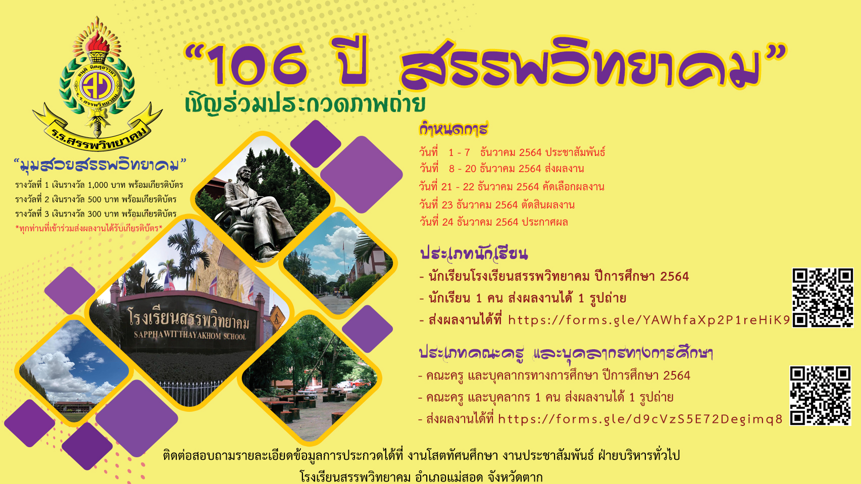 ฝ่ายบริหารงานทั่วไป จัดกิจกรรมประกวดภาพถ่าย “มุมสวยสรรพวิทยาคม” เนื่องในโอกาส “106 ปี สรรพวิทยาคม” จึงใคร่เชิญชวนคณะครู บุคลากร และนักเรียนร่วมส่งผลงานถ่ายภาพมุมสวยๆ ภายในบริเวณพื้นที่โรงเรียนสรรพวิทยาคม