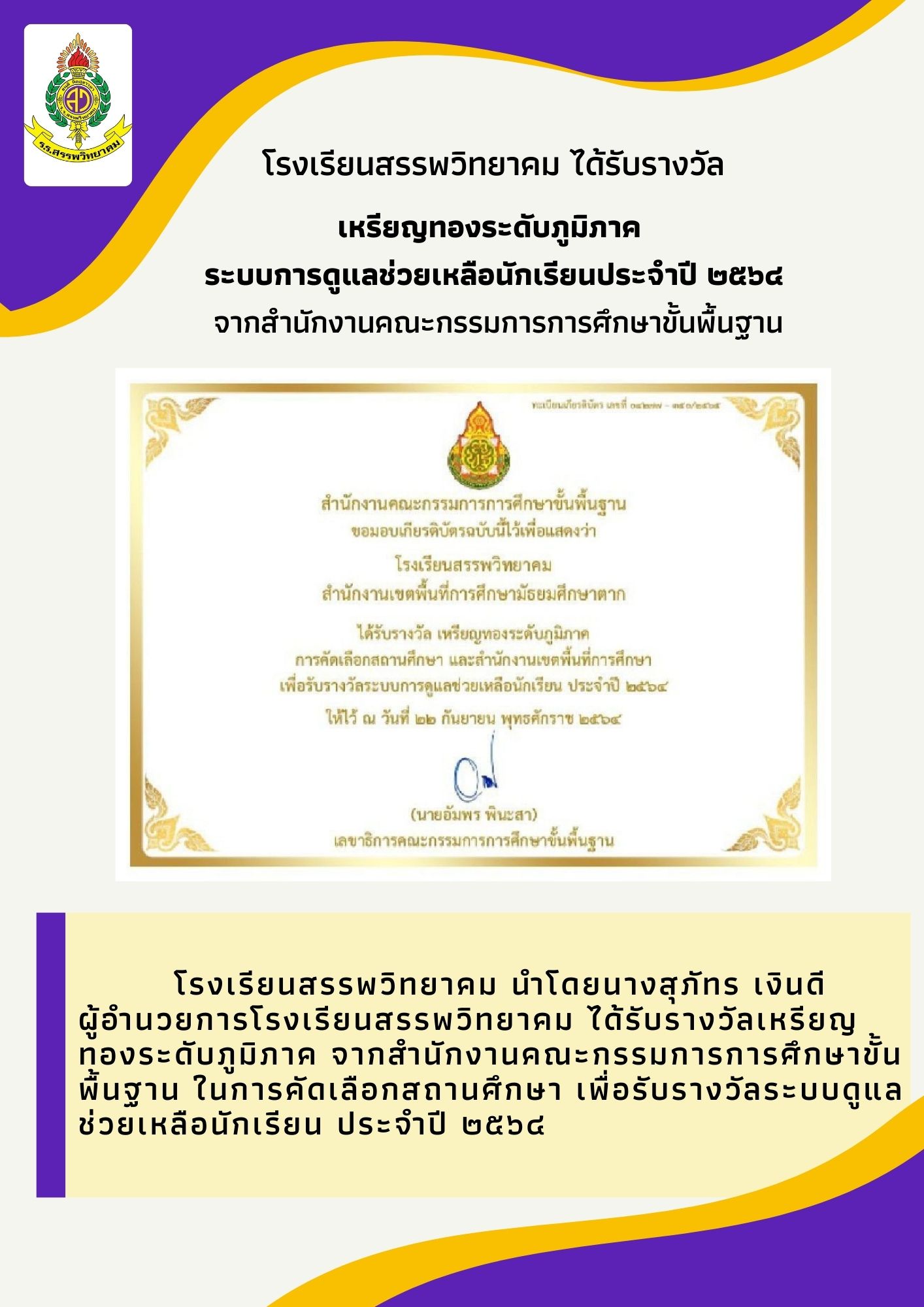 วันที่ ๘ ธันวาคม พ.ศ. ๒๕๖๔ นางสุภัทร เงินดี ผู้อำนวยการโรงเรียนสรรพวิทยาคมได้รับรางวัลเหรียญทองระดับภูมิภาค ระบบการดูแลช่วยเหลือนักเรียนประจำปี ๒๕๖๔ จากสำนักงานคณะกรรมการการศึกษาขั้นพื้นฐาน ในการคัดเลือกสถานศึกษา เพื่อรับรางวัลระบบดูแลช่วยเหลือนักเรียน ประจำปี ๒๕๖๔ ระหว่างวันที่ ๒๒ กันยายน พุทธศักราช ๒๕๖๔