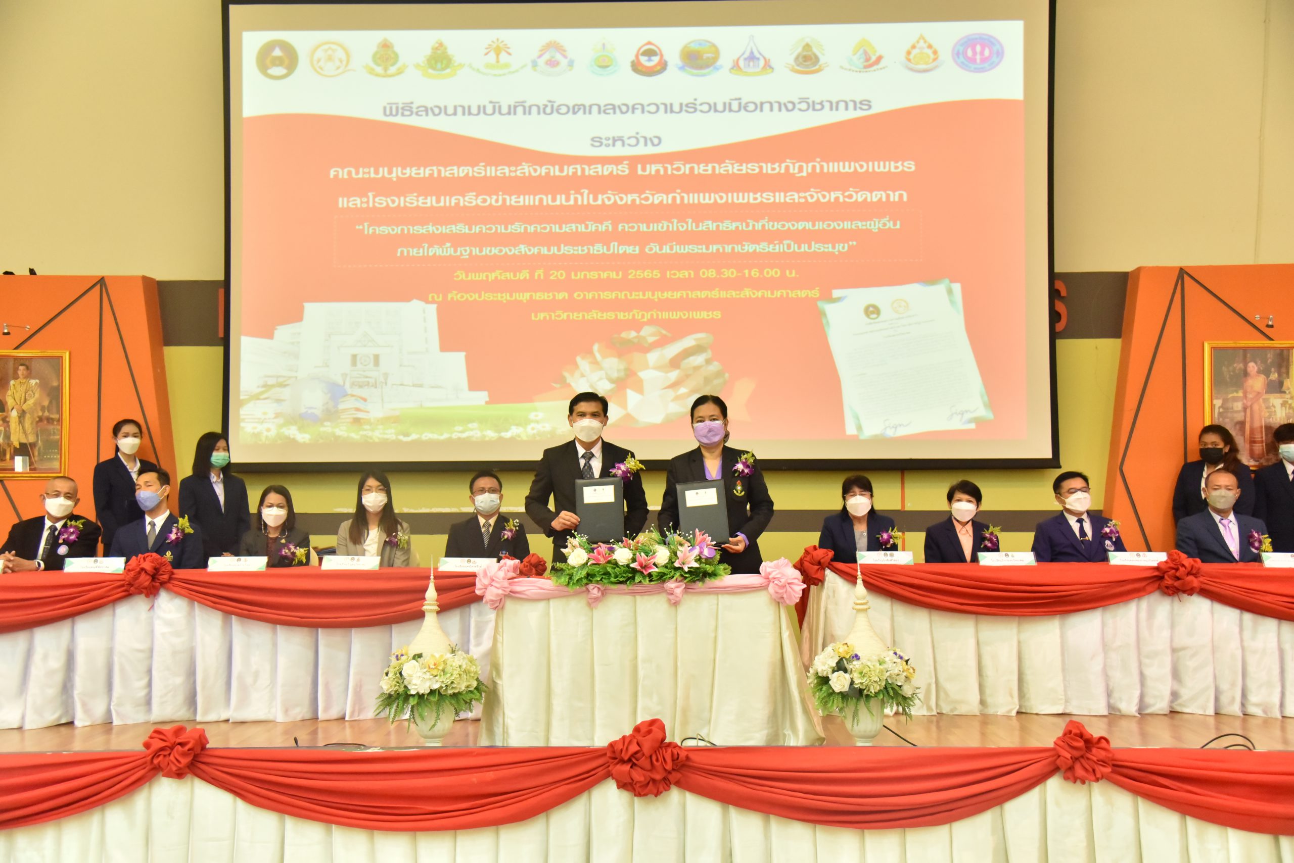 วันที่ ๒๐ มกราคม พ.ศ. ๒๕๖๕ นางสุภัทร เงินดี ผู้อำนวยการโรงเรียนสรรพวิทยาคม พร้อมด้วยคณะผู้บริหาร คณะครู ร่วมพิธีลงนามในบันทึกข้อตกลงความร่วมมือทางวิชาการระหว่างคณะมนุษยศาสตร์และสังคมศาสตร์ มหาวิทยาลัยราชภัฏกำแพงเพชรกับเครือข่ายโรงเรียน ภายใต้การดำเนินงานโครงการ “ส่งเสริมความรักสามัคคี ความมีระเบียบวินัยเข้าใจสิทธิหน้าที่ของตนเองและผู้อื่น” โดยมี ผศ.ดร.กมลวัฒน์ ภูวิชิต คณบดี คณะมนุษยศาสตร์และสังคมศาสตร์ เป็นประธานในพิธีลงนาม ในบันทึกข้อตกลงความร่วมมือทางวิชาการ ระหว่างคณะมนุษยศาสตร์และสังคมศาสตร์ กับเครือข่ายโรงเรียน จำนวน 12 โรงเรียน ณ คณะมนุษยศาสตร์และสังคมศาสตร์ มหาวิทยาลัยราชภัฏกำแพงเพชร