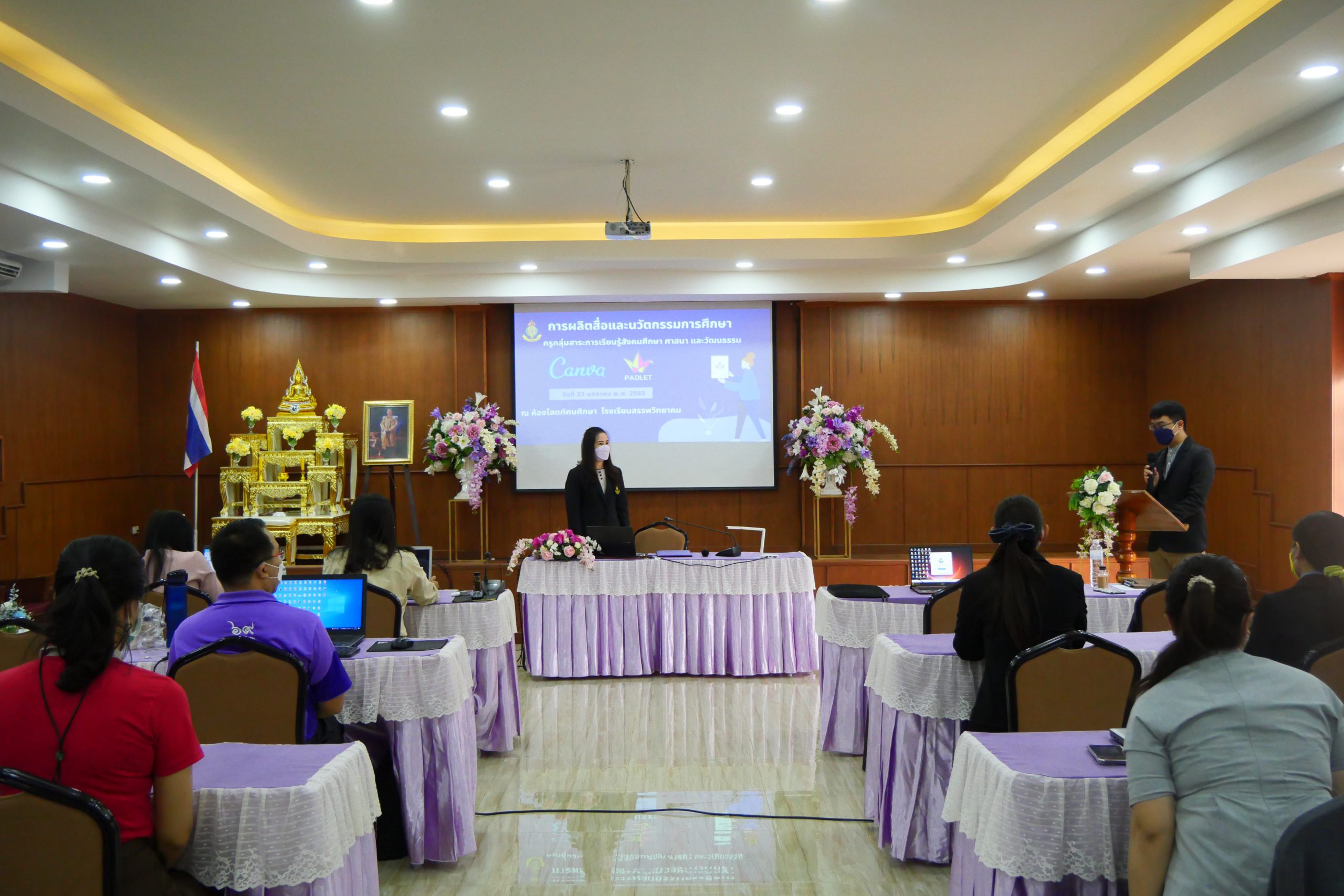 วันที่ ๒๓ มกราคม พ.ศ. ๒๕๖๕ นางสุภัทร เงินดี ผู้อำนวยการโรงเรียนสรรพวิทยาคม มอบหมายให้ นางพัทธนันท์ จิรเลิศธนานนท์ รองผู้อำนวยการโรงเรียนสรรพวิทยาคม พร้อมด้วยคณะครูกลุ่มสาระการเรียนรู้สังคมศึกษา ศาสนา และวัฒนธรรม จัดอบรมการผลิตสื่อและนวัตกรรมการศึกษา โดยมี นางพัทธนันท์ จิรเลิศธนานนท์ รองผู้อำนวยการโรงเรียนสรรพวิทยาคม เป็นประธานพิธีเปิดการอบรม นายเอกชัย พันธุลี หัวหน้ากลุ่มสาระการเรียนรู้สังคมศึกษา ศาสนา และวัฒนธรรม กล่าวรายงาน วัตถุประสงค์การจัดการอบรมดังกล่าว เพื่อส่งเสริมให้ครูผู้สอนในกลุ่มสาระสังคมศึกษา ศาสนาและวัฒนธรรม ได้สร้างและหรือพัฒนานวัฒกรรมทางการศึกษา เพื่อมุ่งหวังให้ครูผู้สอนในกลุ่มสาระ ได้ใช้นวัตกรรมในการจัดการเรียนการสอน อย่างมีประสิทธิภาพยิ่งขึ้น อันจะเกิดประโยชน์ต่อนักเรียนเป็นสำคัญ ณ โรงเรียนสรรพวิทยาคม