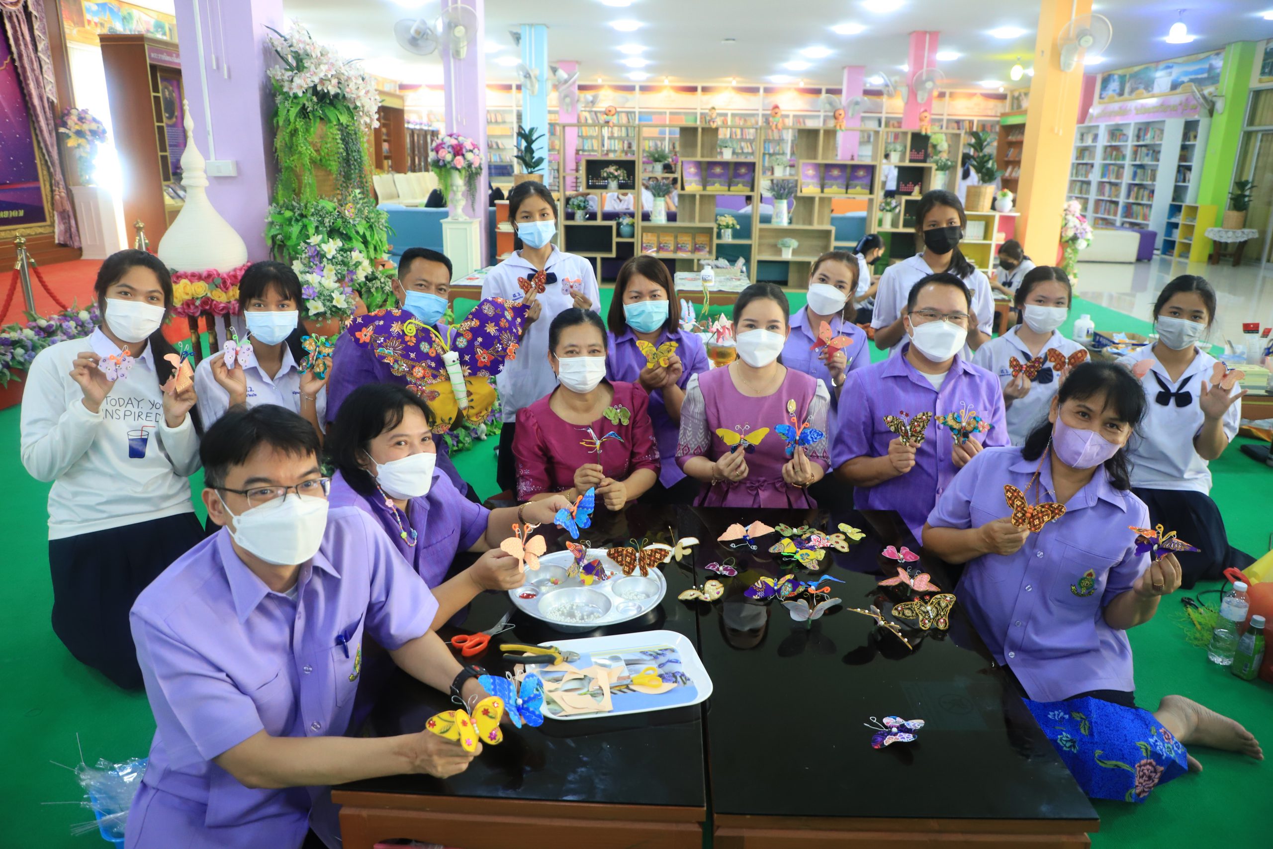 วันที่ ๒๔ พฤษภาคม พ.ศ. ๒๕๖๕ นางสุภัทร เงินดี ผู้อำนวยการโรงเรียนสรรพวิทยาคม พร้อมด้วยคณะครูและนักเรียน โรงเรียนสรรพวิทยาคม ร่วมกิจกรรม ร้อยใจ แห่งความภักดี ประดิษฐ์ผีเสื้อร่วมนิทรรศการ เฉลิมพระเกียรติ สมเด็จพระนางสิริกิติ์ พระบรมราชชนนี พันปีหลวง เนื่องในโอกาส มหามงคลเฉลิมพระชนมพรรษา ๙๐ พรรษา ณห้องสมุดโรงเรียนสรรพวิทยาคม